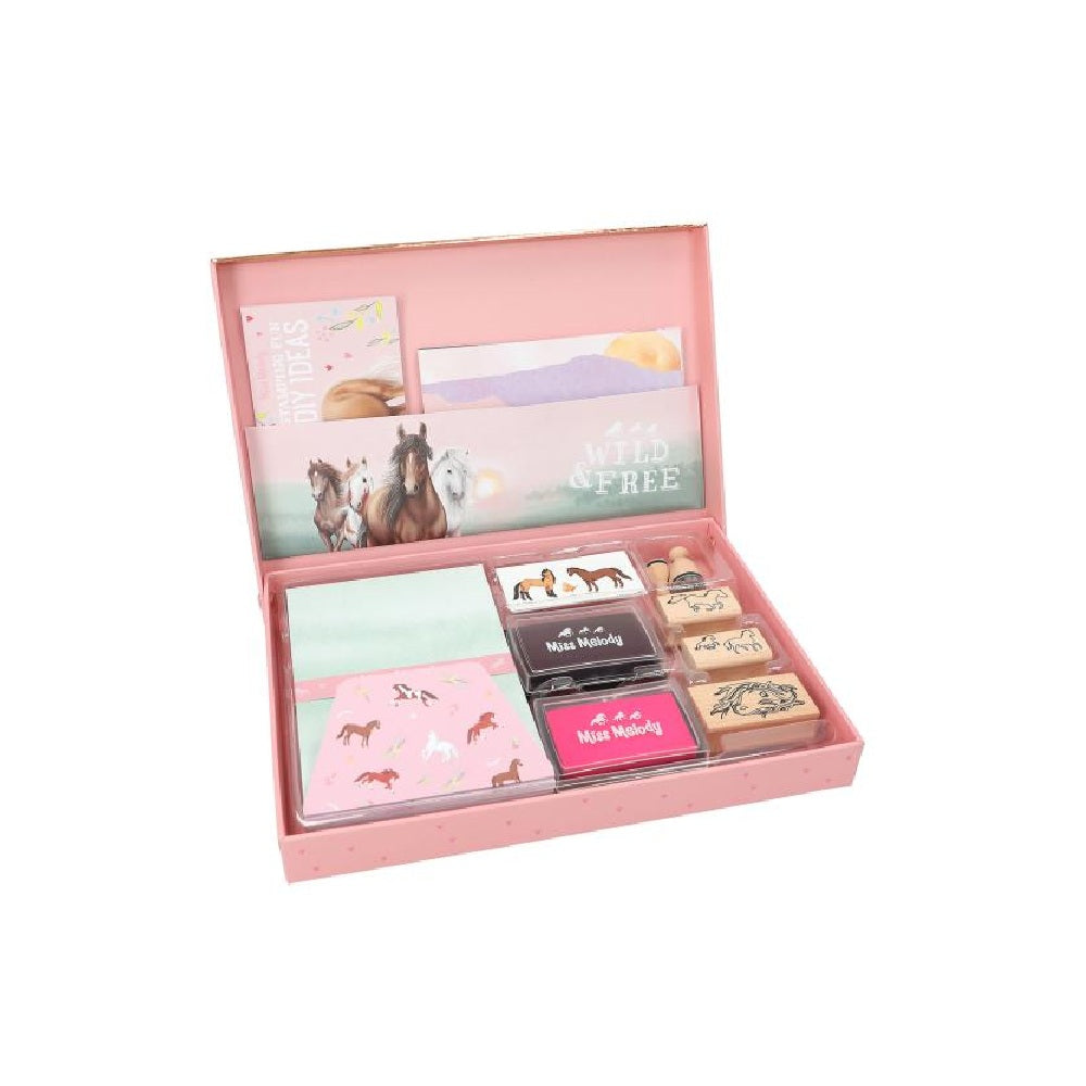 Diversión a tope con cuños de Miss Melody. Con 5 cuños de madera (caballos, corazones, estrellas), dos 2 almohadillas de tinta (rosa fuerte, lila), cuatro hojas de pegatinas, 12 tarjetas monocolor, 12 tarjetas ilustradas y 12 sobres a juego para crear obras de arte en torno a los caballos. Para regalar y enviar. Se incluye un librito con ejemplos creativos muy fáciles de seguir.