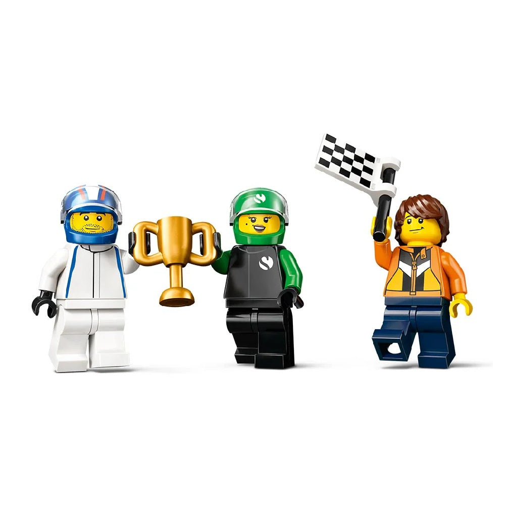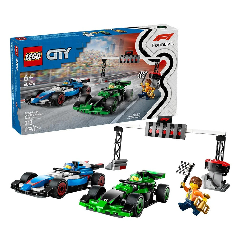 • ¿Qué contiene la caja? Todo lo que los niños necesitan para construir 2 autos de carreras de F1® LEGO® y un puente de luces de juguete, además de minifiguras de pilotos de Sauber y VCARB, una minifigura de un director de carrera y un trofeo.