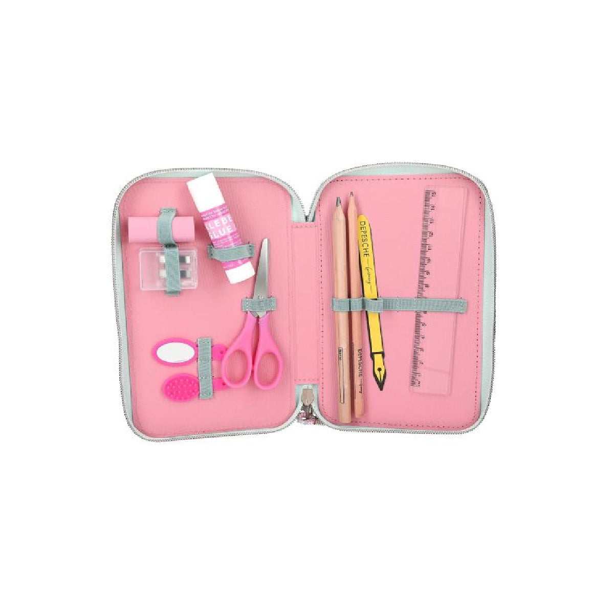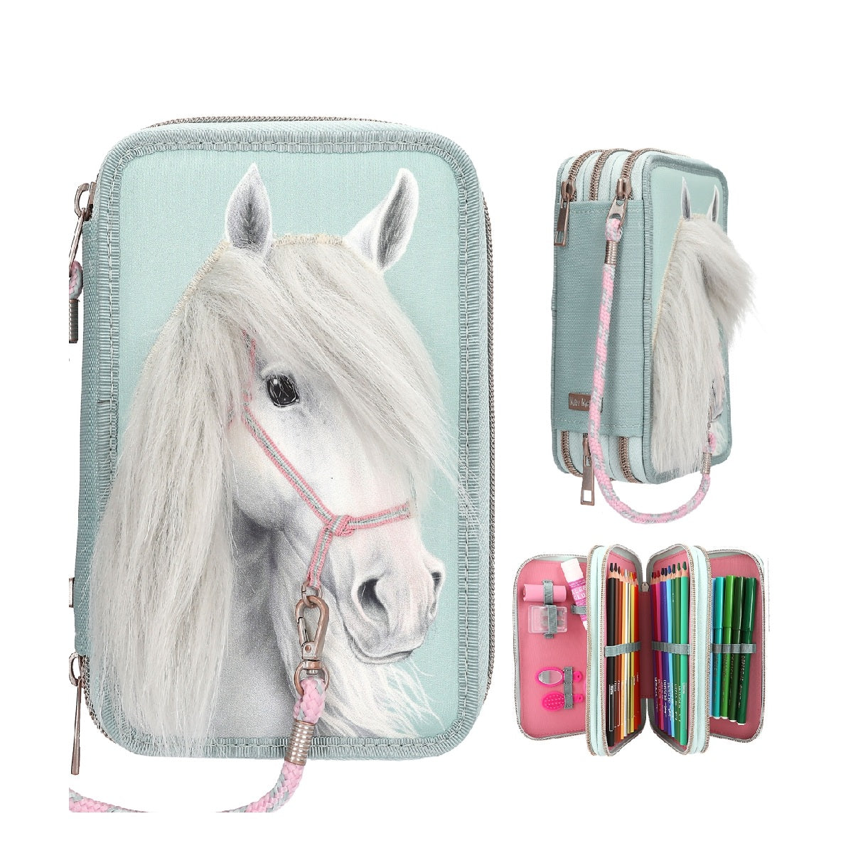 En la cara delantera de este estuche de suave color salvia, luce el busto del majestuoso caballo Miss Melody con larga crin blanca aplicada y con ronzal aplicado del que parte un cordón rosa que llega hasta el tirador de la cremallera. Y para que almohazar al caballo se convierta en una diversión a lo grande, en el interior del estuche vienen un cepillito y un espejo. Además, en los tres compartimentos separados se incluyen 18 lápices de colores, 18 rotuladores, 2 lápices, goma de borrar, sacapuntas, tijeras y pegamento en barra. Material principal: poliéster 100 por 100.